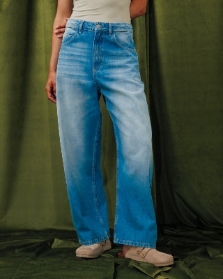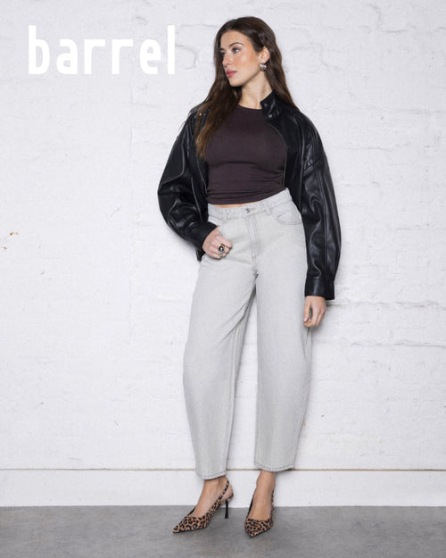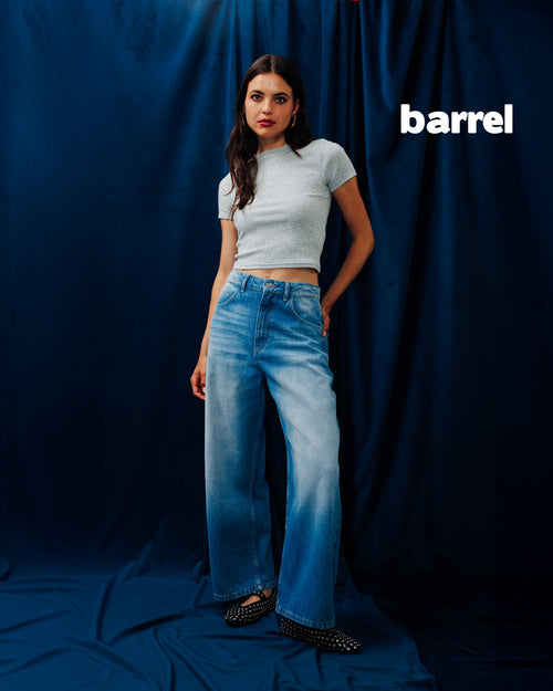 Le jean barrel est un jean qui épouse les hanches, se fait plus ample aux cuisses, devient carrément volumineux à la hauteur des genoux, puis se resserre aux chevilles.